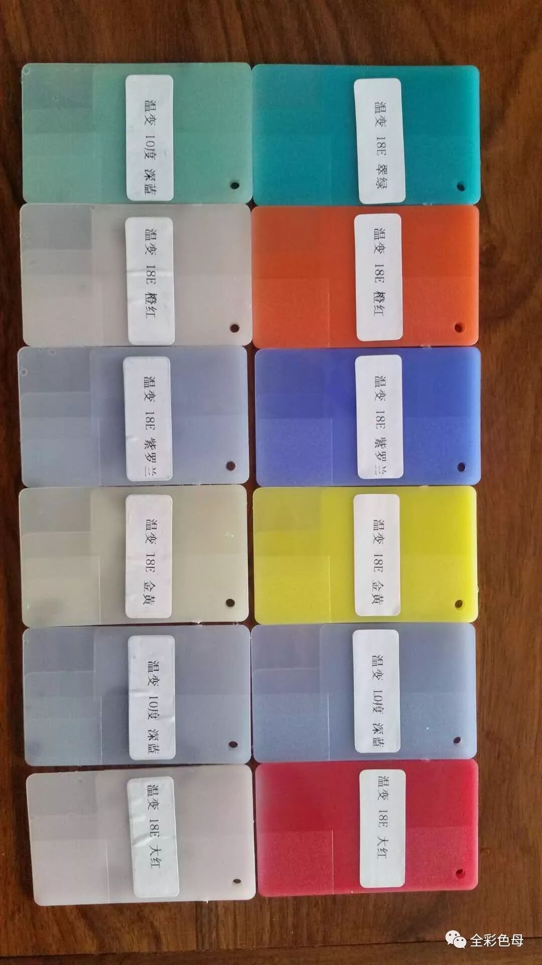 2、感温色母系列:呈现不同温度下多种色彩的变化,温度在10℃--35℃--60℃下发生变化,适用于儿童玩具,婴儿餐具,特定温度环境下警示牌。。。